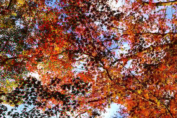 通天橋を望む臥雲橋は、紅葉ピーク時には立ち止まりの混雑を防ぐために撮影不可となりますが、「今日はまだ大丈夫です」とガードマンさん。京都の紅葉名所はそれぞれ、見え方も見頃もまちまちですが、東福寺の圧巻さは木造の橋から眼下いっぱいに眺める事が出来る、谷間の紅葉でしょう。日の当たる場所から色付き始めていますが、深い高低差にはまだまだ、長く楽しむことが出来そうです。