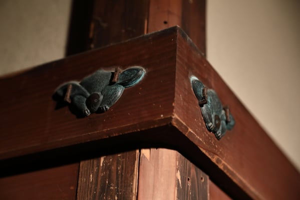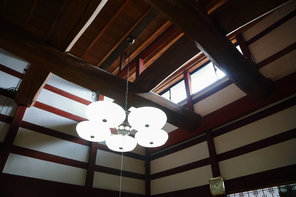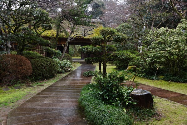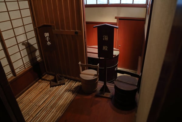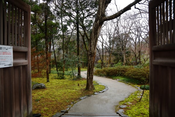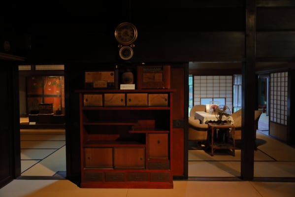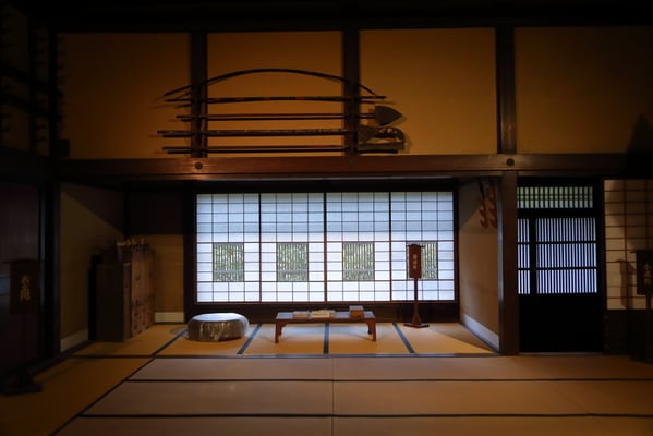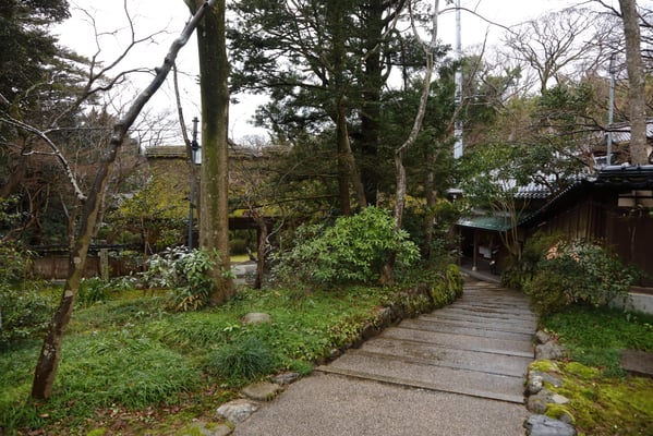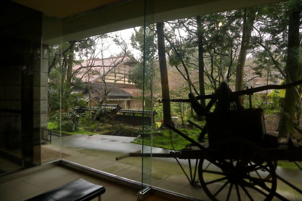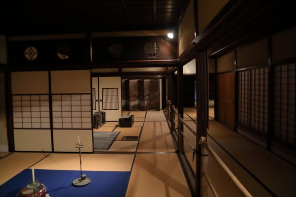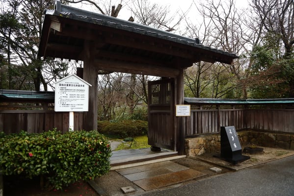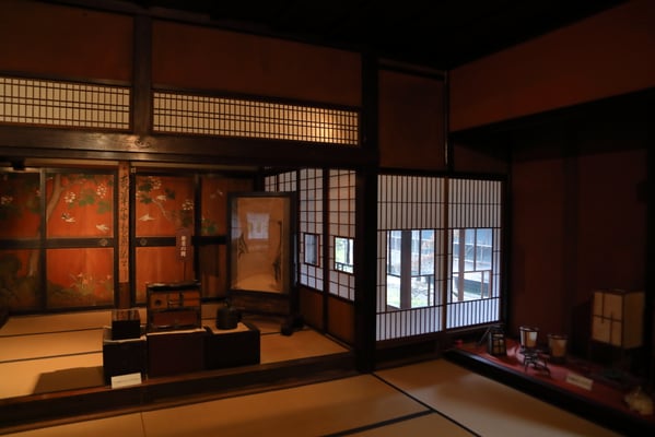 敷地を囲う生垣は確かに大きな敷地であることは窺えるが通りに面した入り口の門は一見簡素な造りである。そこから鬱蒼とした樹林に囲まれつつ歩き進めると、通常なら位の高い屋敷はお城が例のように高い位置に建てられそうなものが、なだらかに元の地面より掘り下げられていて、その先に立派な茅葺の表門、前庭のその先に重厚な主屋が建っている。つまり表からその全貌が窺い知ることは出来ない立地と造りになっていて、それはひとえに「豪奢な造りにして幕府に目がつけられないように」徹底して配慮された藩の思想が敷地の全てに体現され、それが丸ごと今も残されているという事だそうだ。故に、藩主の寝泊りする部屋の天井も例えば格式の高いとされる格天井となっていなかったり、欄間にあえて女家紋が彫られていたり、など、至る所の意匠も建物内部の細々も大変興味深い。